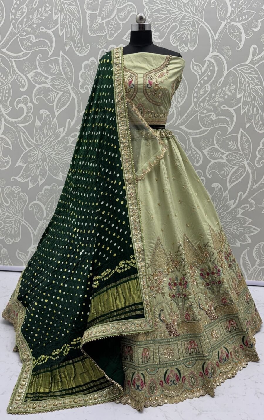 Make a stunning entrance at any wedding with this alluring green slub silk traditional lehenga choli. The intricate embroidery work adds a touch of elegance to this outfit, making it a perfect choice for brides or wedding guests. The vibrant green color is sure to make you stand out in the crowd. The slub silk fabric drapes beautifully and is comfortable to wear all day long. Style this lehenga choli with statement jewelry and a matching clutch for a complete look. Whether you’re attending a traditional Indian wedding or a cultural event, this outfit is sure to make a statement.