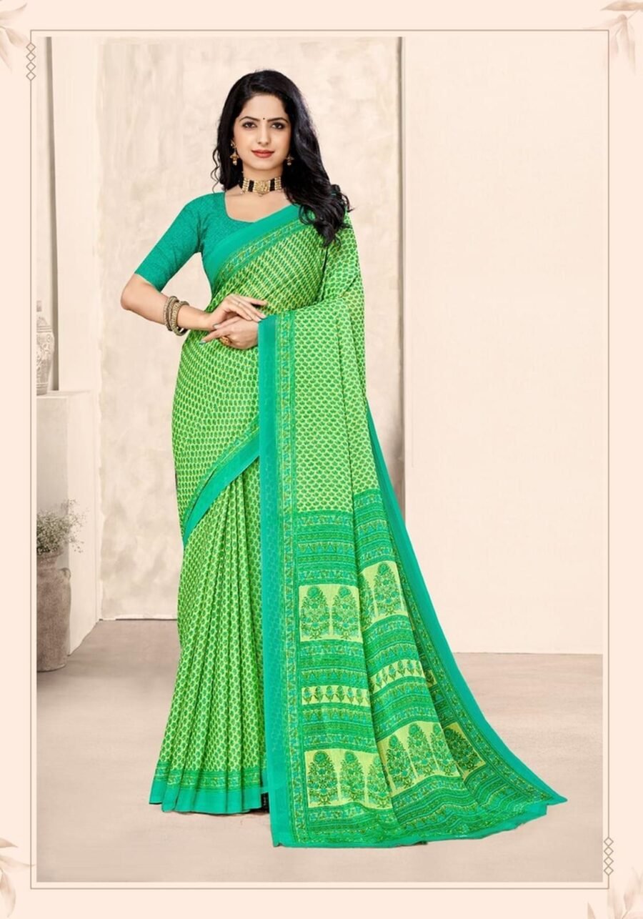Elevate your casual wardrobe with this charming green chiffon classic saree. The vibrant green color and printed design make this saree a standout piece for any occasion. The lightweight chiffon fabric drapes beautifully, allowing for easy movement and a flattering silhouette. Style this saree with statement jewelry and a sleek bun for a perfect casual look. The classic style and versatile color make it a must-have for every fashion-forward woman. This saree is perfect for casual events, daytime gatherings, or even a day at the office. Add this elegant piece to your collection and effortlessly elevate your style game.
