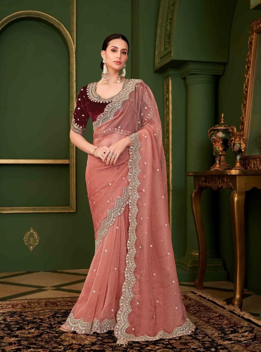 Make a stunning statement at any party with this vibrant coral georgette traditional saree. The intricate embroidery work adds a touch of elegance to this traditional attire, making it perfect for special occasions. The georgette fabric drapes beautifully, giving you a flattering silhouette. Pair this saree with statement jewelry and a sleek updo for a glamorous look. The vibrant coral color is sure to make you stand out in a crowd, while the traditional style adds a timeless charm to your ensemble. Elevate your ethnic wardrobe with this exquisite saree and be the epitome of grace and style.