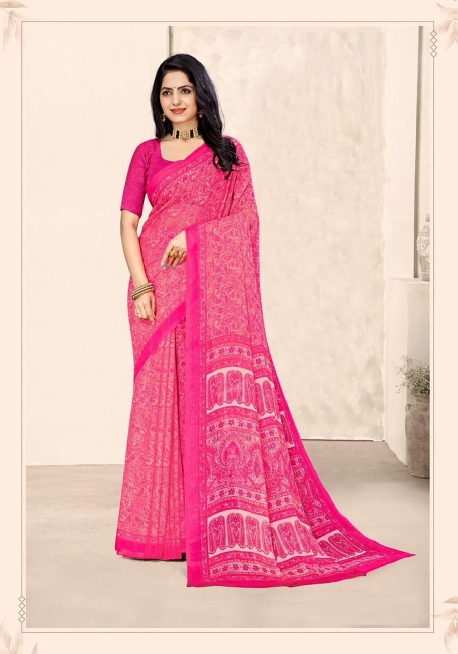 Elevate your casual look with this fabulous pink chiffon classic saree. Made from lightweight chiffon fabric, this saree features a stunning printed design that adds a touch of elegance to your outfit. The classic style of this saree makes it perfect for various occasions, from casual gatherings to formal events. Style this saree with minimal jewelry and a pair of heels for a chic look. The chiffon fabric drapes beautifully and offers a comfortable fit, making it a versatile piece for your wardrobe. Stand out in style with this pink chiffon saree that exudes charm and sophistication.